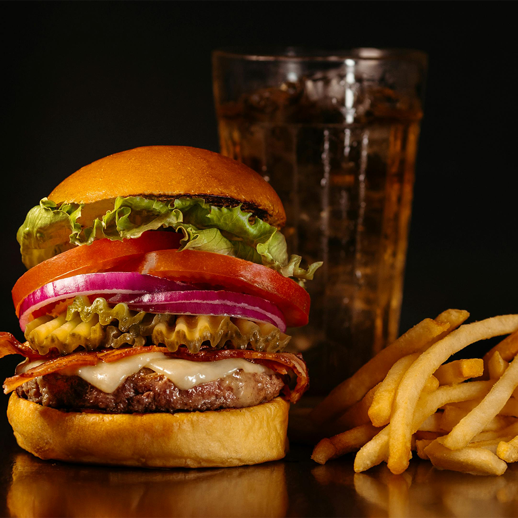 Jugosa carne en pan artesanal, con queso derretido, tocineta crujiente, lechuga fresca, tomate, pepinillo, cebolla morada y salsa de la casa. Incluye papas fritas y bebida.